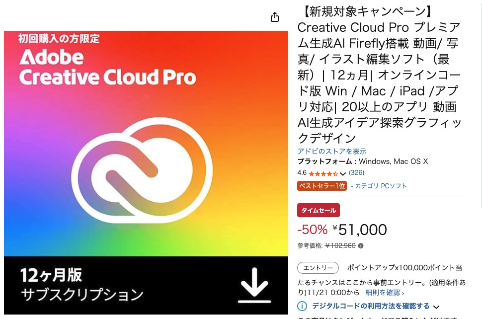 AmazonブラックフライデーセールでCreative Cloud 51,000円にて発売中!!