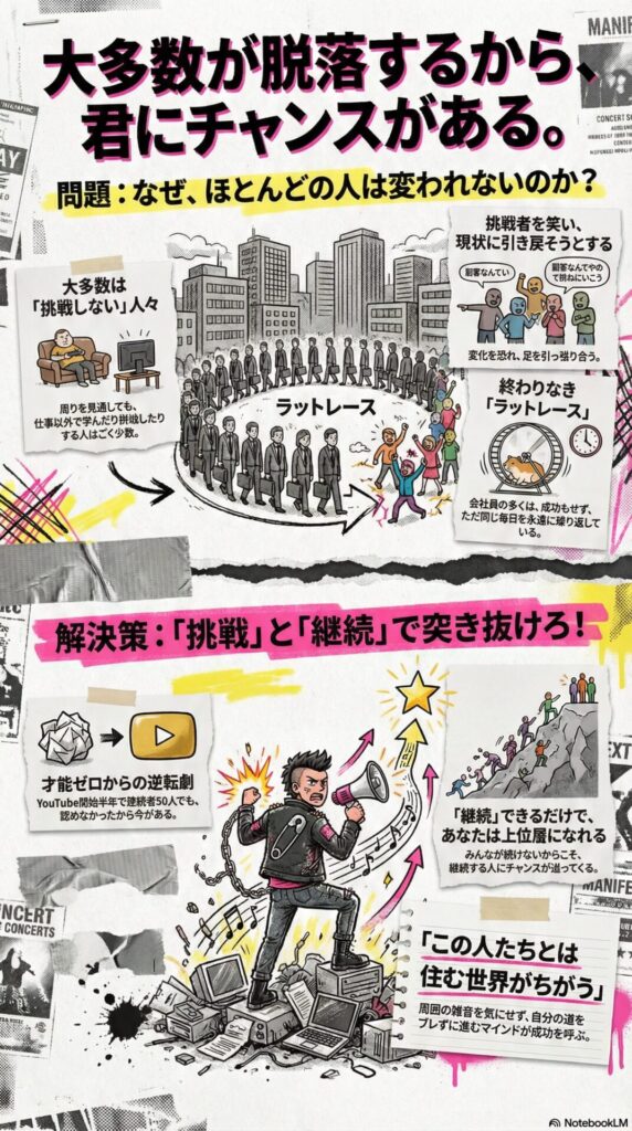 挑戦するひとも少ないが、継続できるひとはもっと少ないからこそ、継続できてるひとが旨味(広告収益)などを吸うことができてるんです。みんなが継続してしまったら旨味なんてそこには残ってないんです。