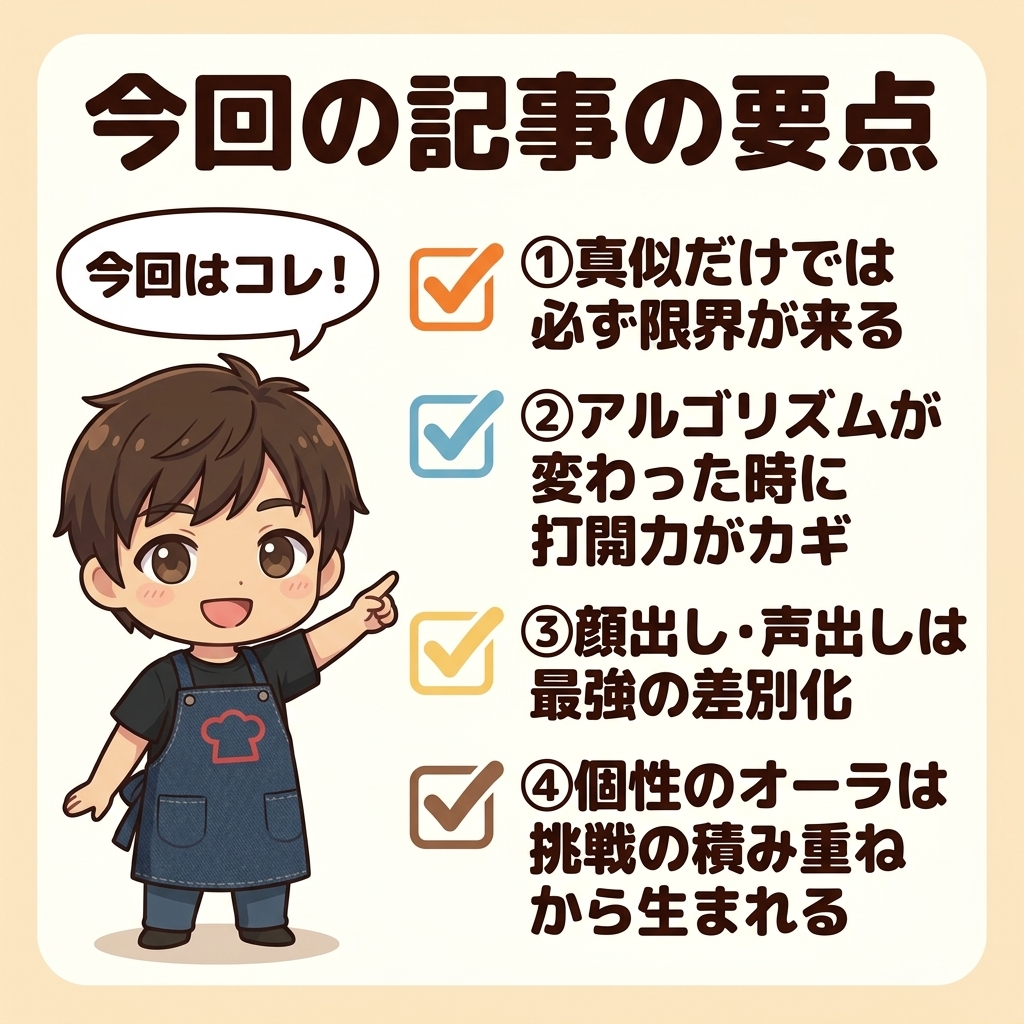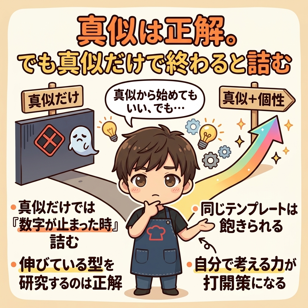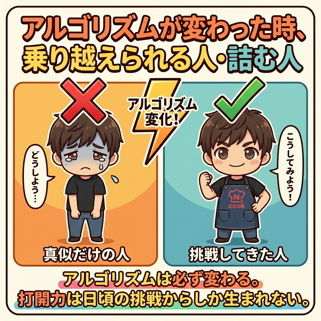 昨日まで機能していた投稿パターンが、今日から通用しなくなる。これは誰にでも起きます。私にも起きました。そういう時に、真似だけで戦ってきた人と、自分なりに挑戦し続けてきた人とでは、まったく違う動き方をします。