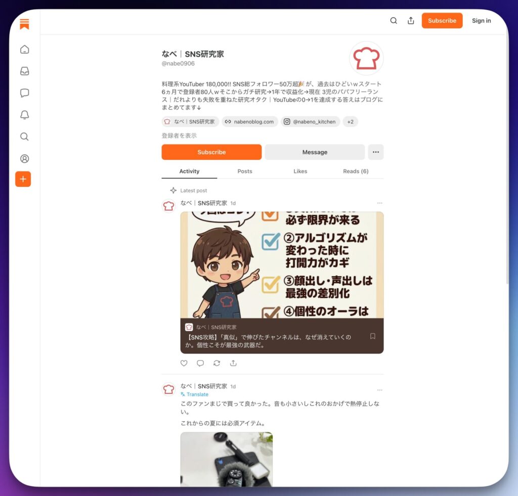 SubstackのNotesは、その感覚に近い。フォローした人の投稿が流れてくる。会話が生まれる。アルゴリズムにねじ曲げられていない、人と人がつながる場所。