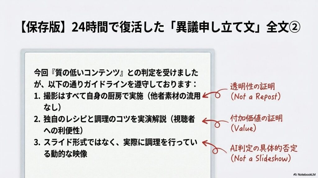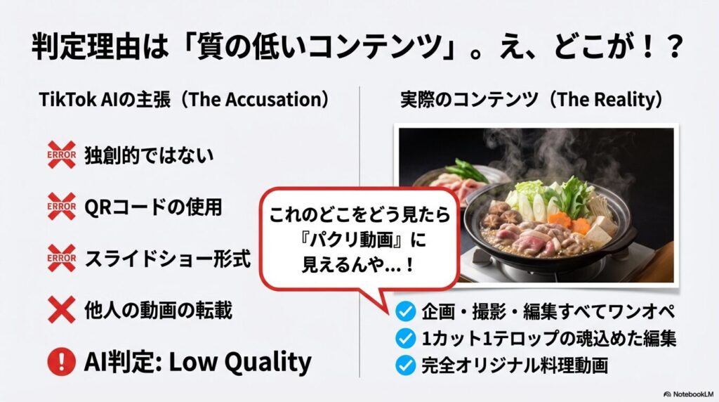 それなのに、突きつけられた判定は「質の低いコンテンツ」。「これの どこをどう見たら『質の低いパクリ動画』に見えるんや…!」