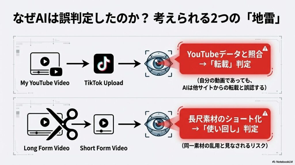 ①「YouTubeの動画をそのままTikTokに上げる」という手法をとっていたため、AIが「これは転載だ!」と勘違いした可能性が高いです。(※もちろん、自分の動画なので転載しても本来は規約違反ではありません!)