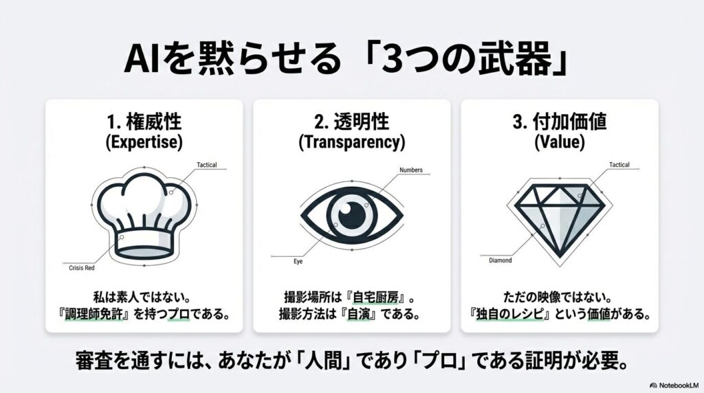 - プロとしての権威性(Expertise) 「ただの一般人」ではなく「調理師免許を持つプロ」であることを明示。