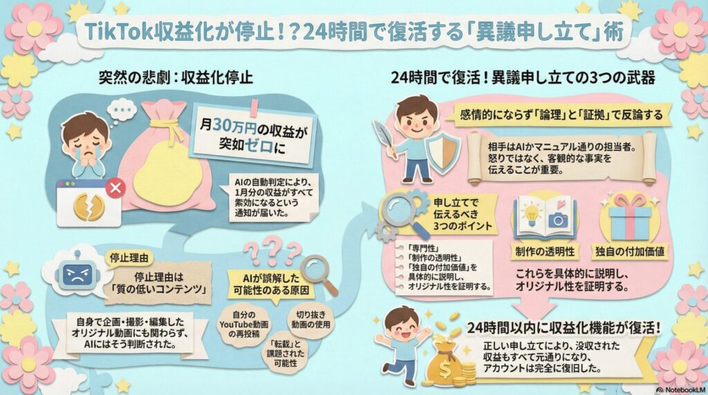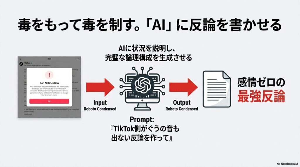 「今回の状況と違反通知のスクリーンショットをすべてAIに渡し、TikTok側がぐうの音も出ない反論文章を作らせる」