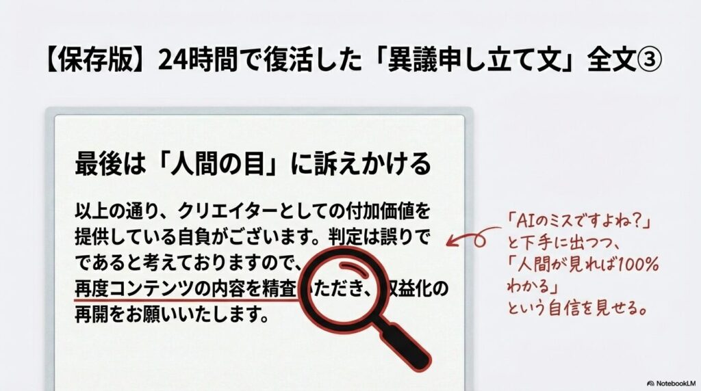 ポイントは、「AI判定の誤りですよね?」と下手にでつつも、「人間のスタッフが見てくれれば100%わかるはずだ」という自信を見せることです。