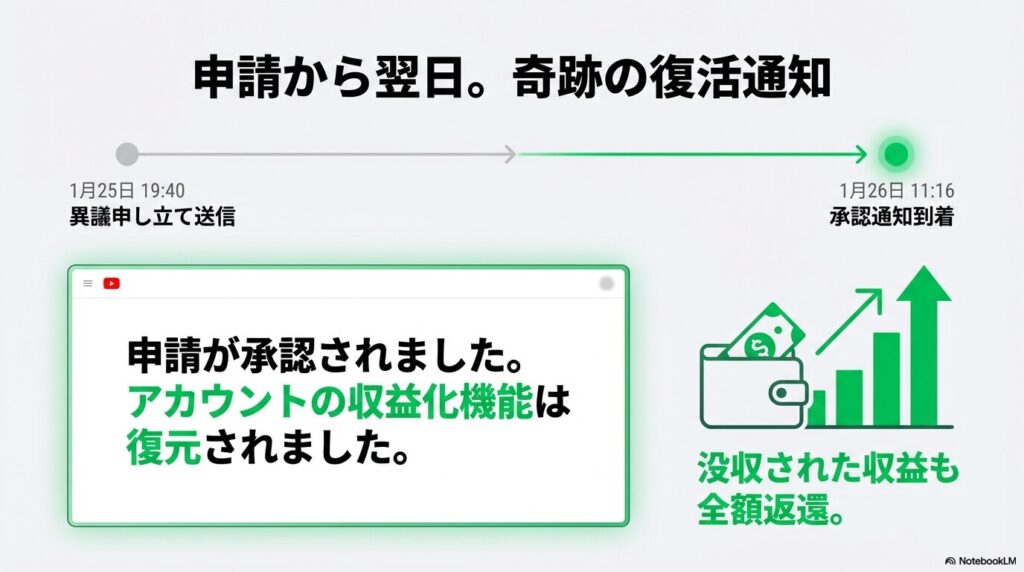 「申請が承認されました。アカウントの収益化機能は復元されました。」