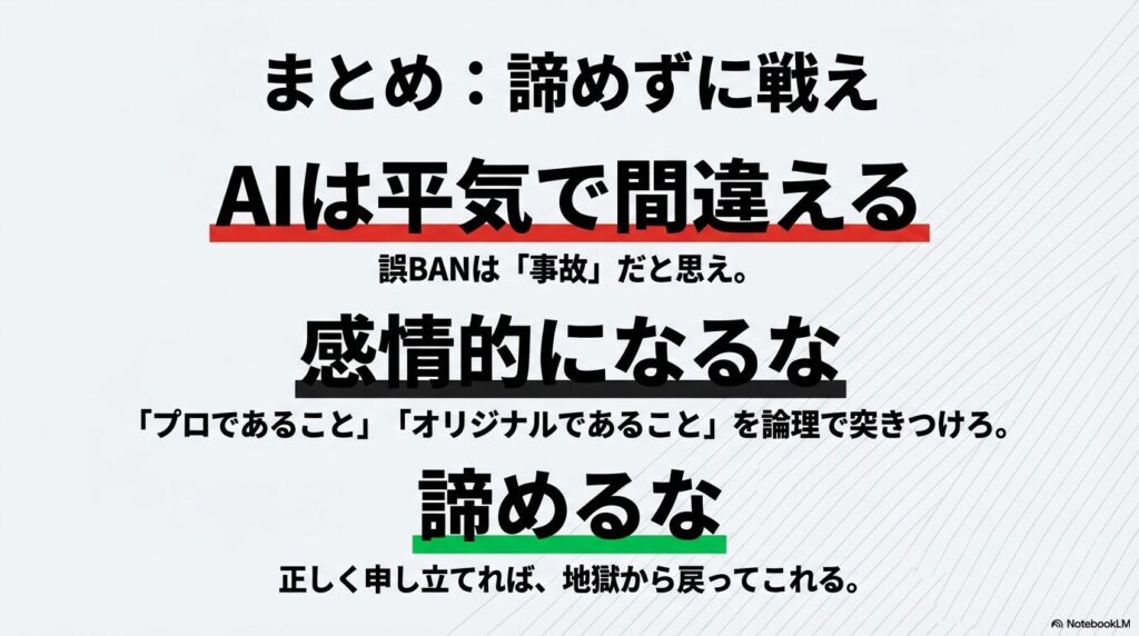 - AIは平気で間違える。 誤BANは誰にでも起こる「事故」だと思え。
