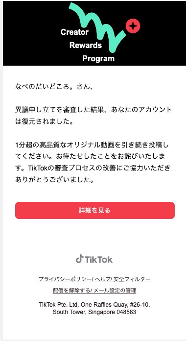 無事に制限は解除され、没収されかけていた今月分の収益もすべて戻ってきました。 対応してくれたTikTokの担当者さん(人間)、本当にありがとう・・・